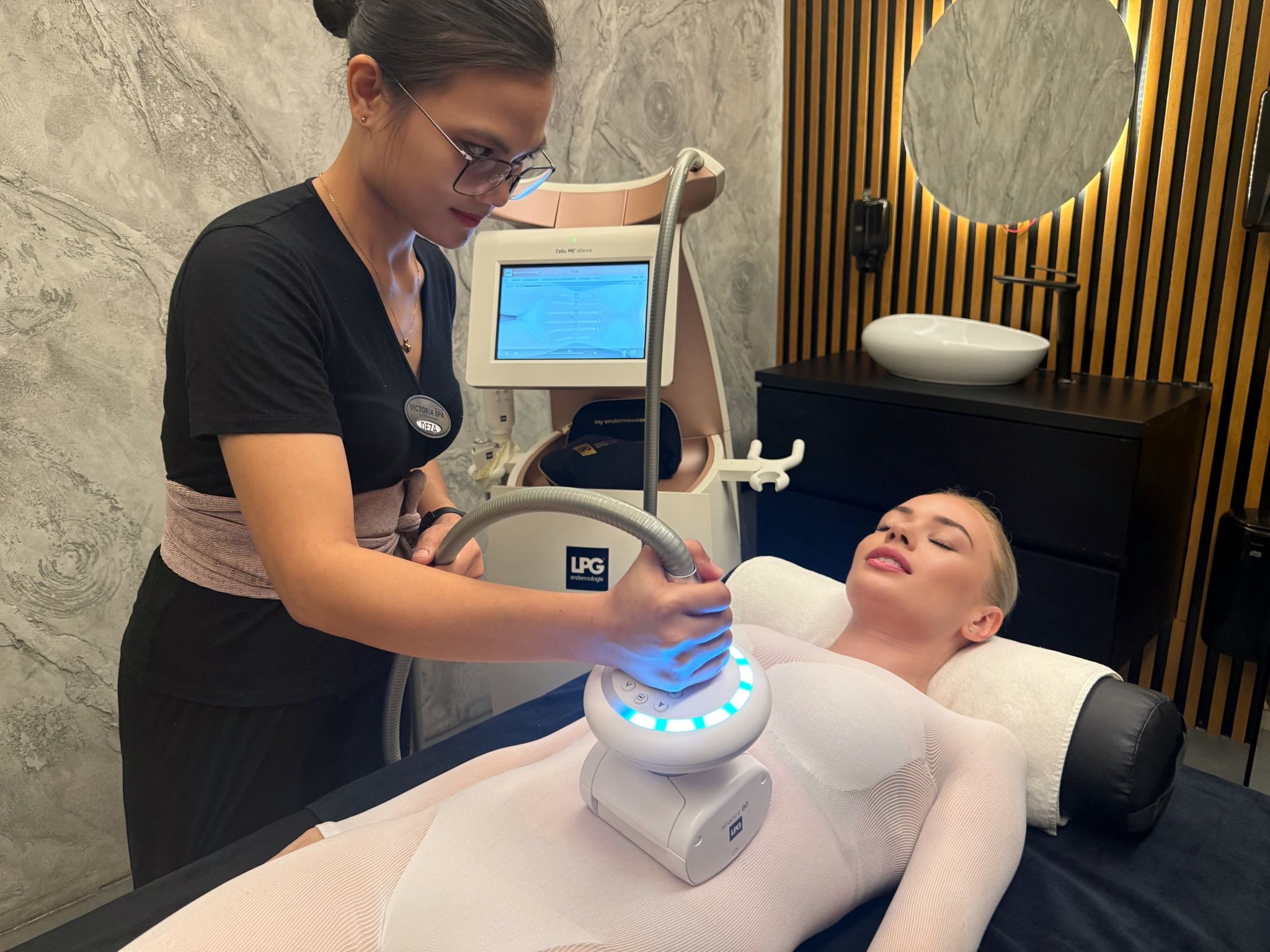 The therapy starts with application of a cool gel on the legs to protect the veins; there is a slimming or firming gel stretch – wrap next; application of a calming aloe vera cream; 40 min.- anti-cellulite massage.
